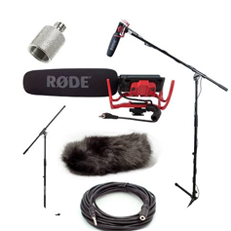 Microphones and audio recorders along with stands and monitoring equipment.